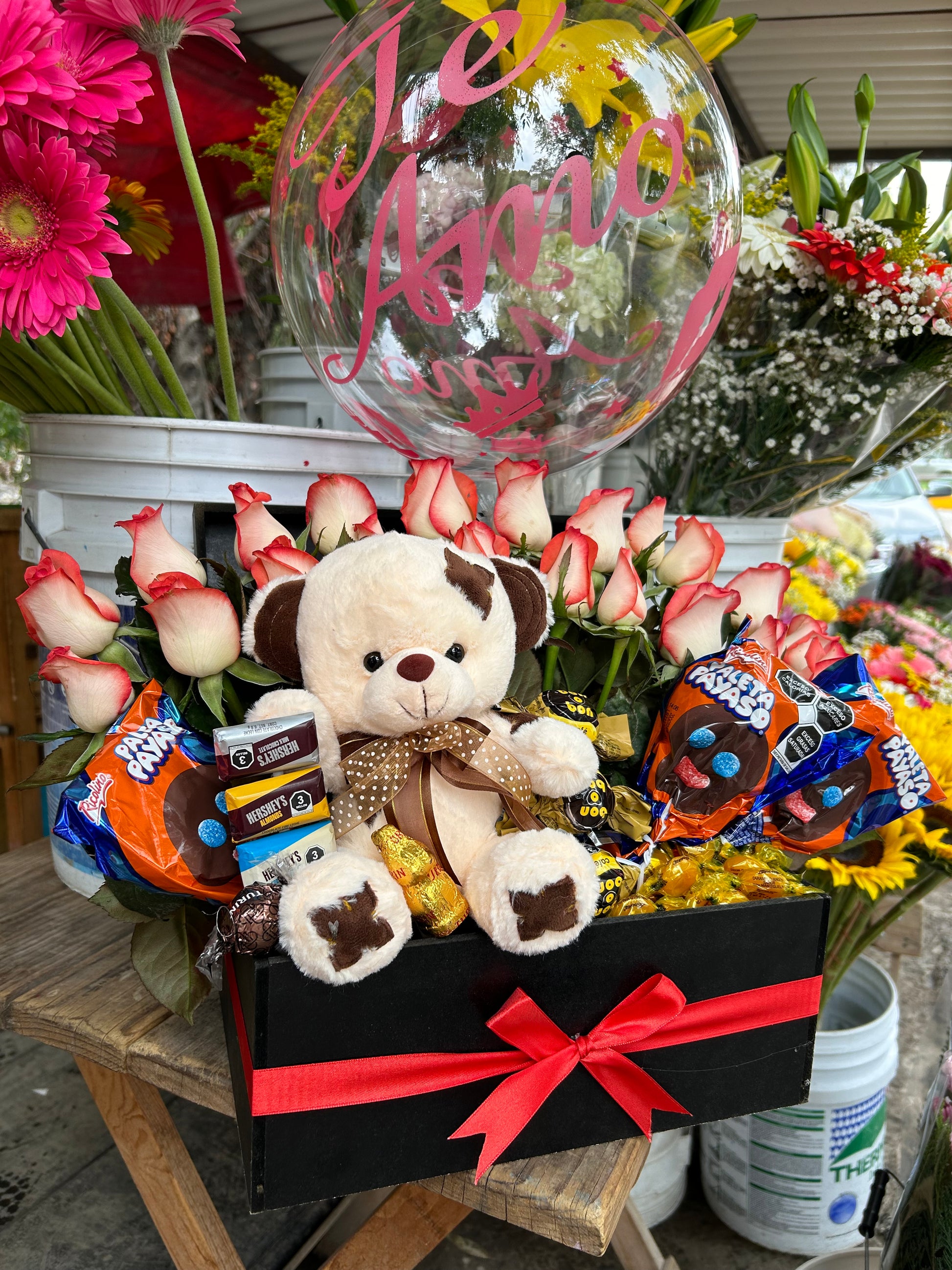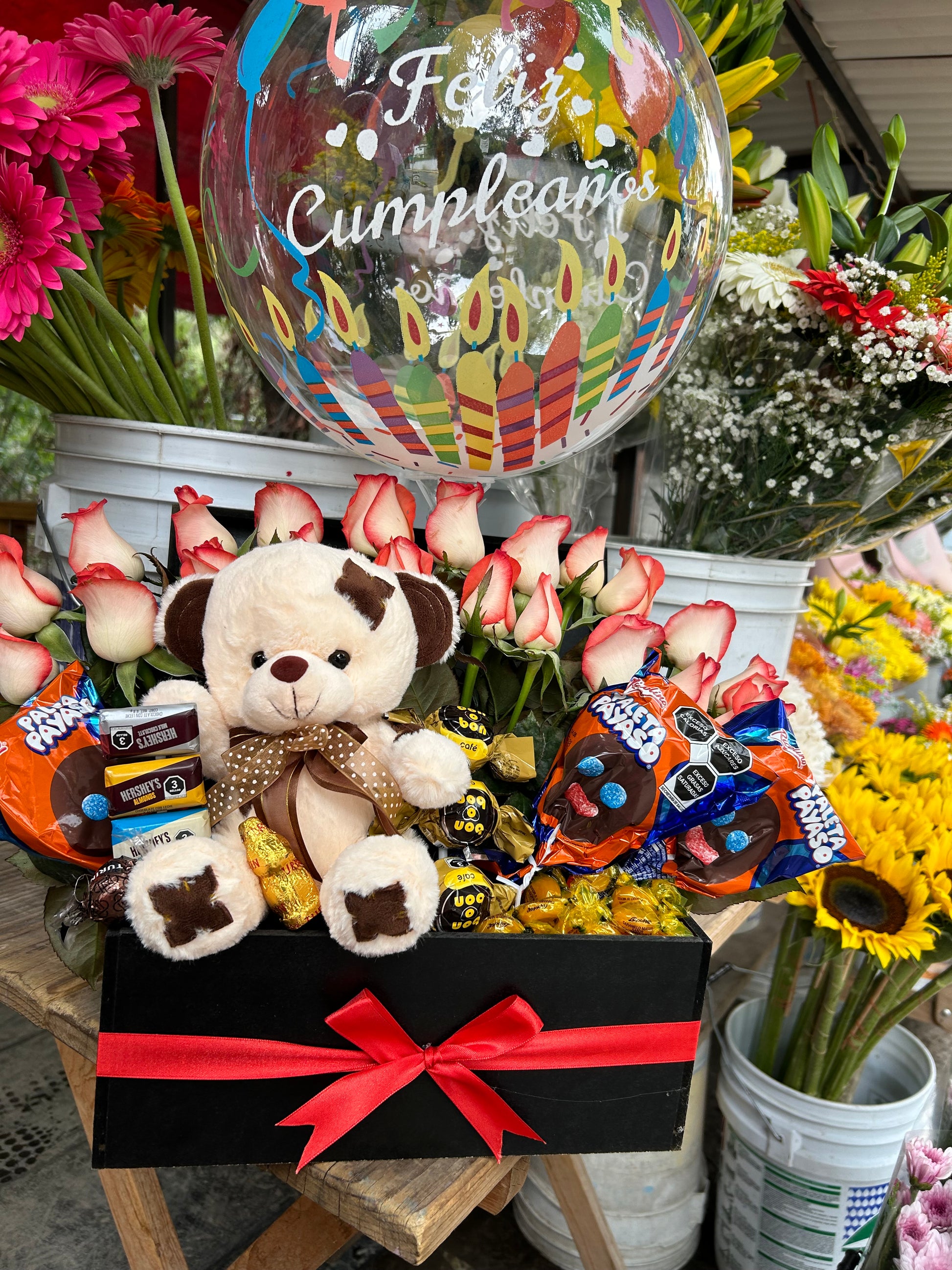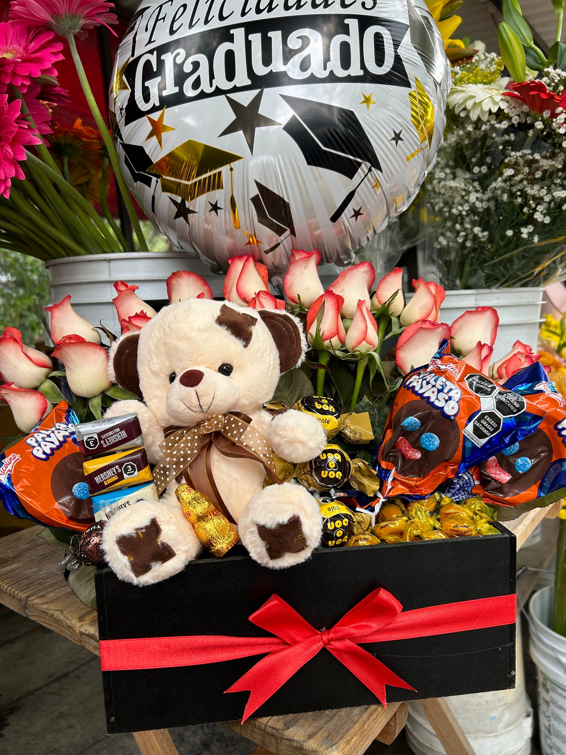 El arreglo está compuesto por rosas de color, oso de peluche, chocolates varios, dulces varios y globo con temática de cumpleaños o graduación.