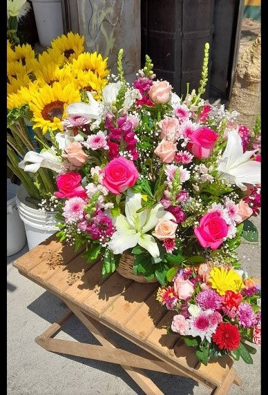 El arreglo esta compuesto por rosas fucsias, rosas rosas, malibu, perritos morados, casa blanca y gipsofilia.
