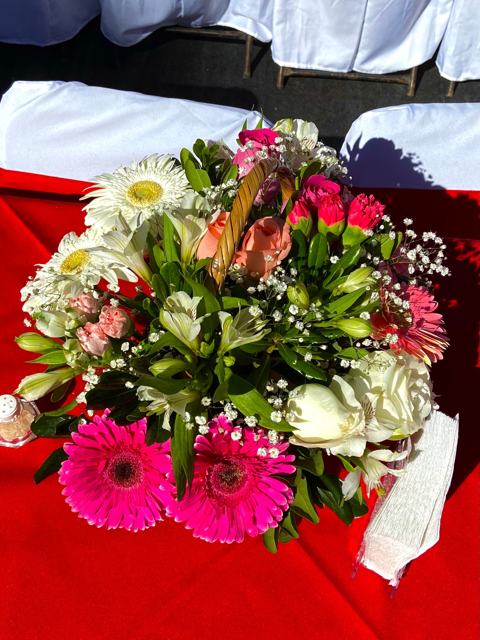 El arreglo está compuesto por gerberas, rosas, claveles, astrolilis y follaje verde.