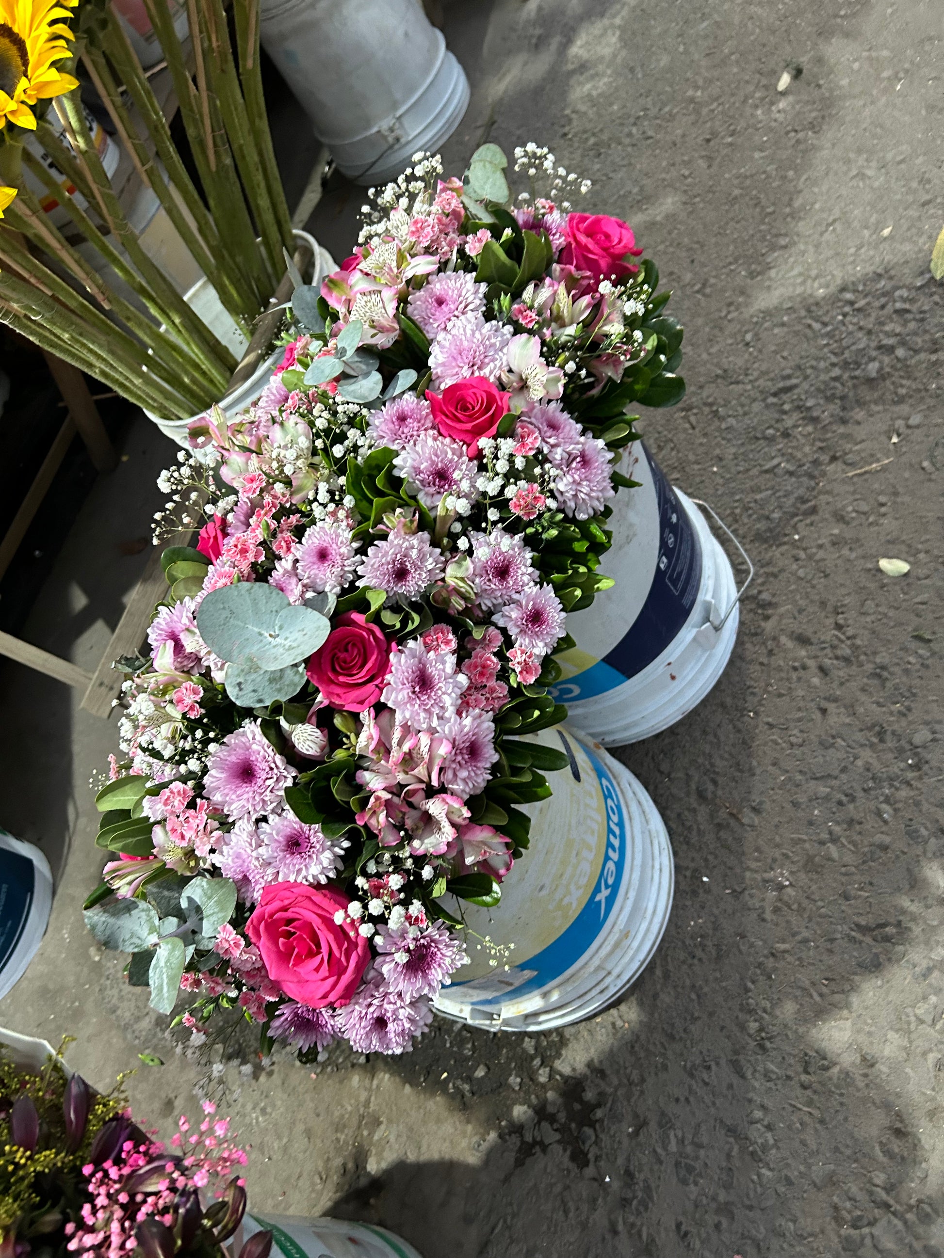 El centro de mesa está compuesto de Malibú, raffine rosa , rosas fucsia, astrolilis y follajes varios.