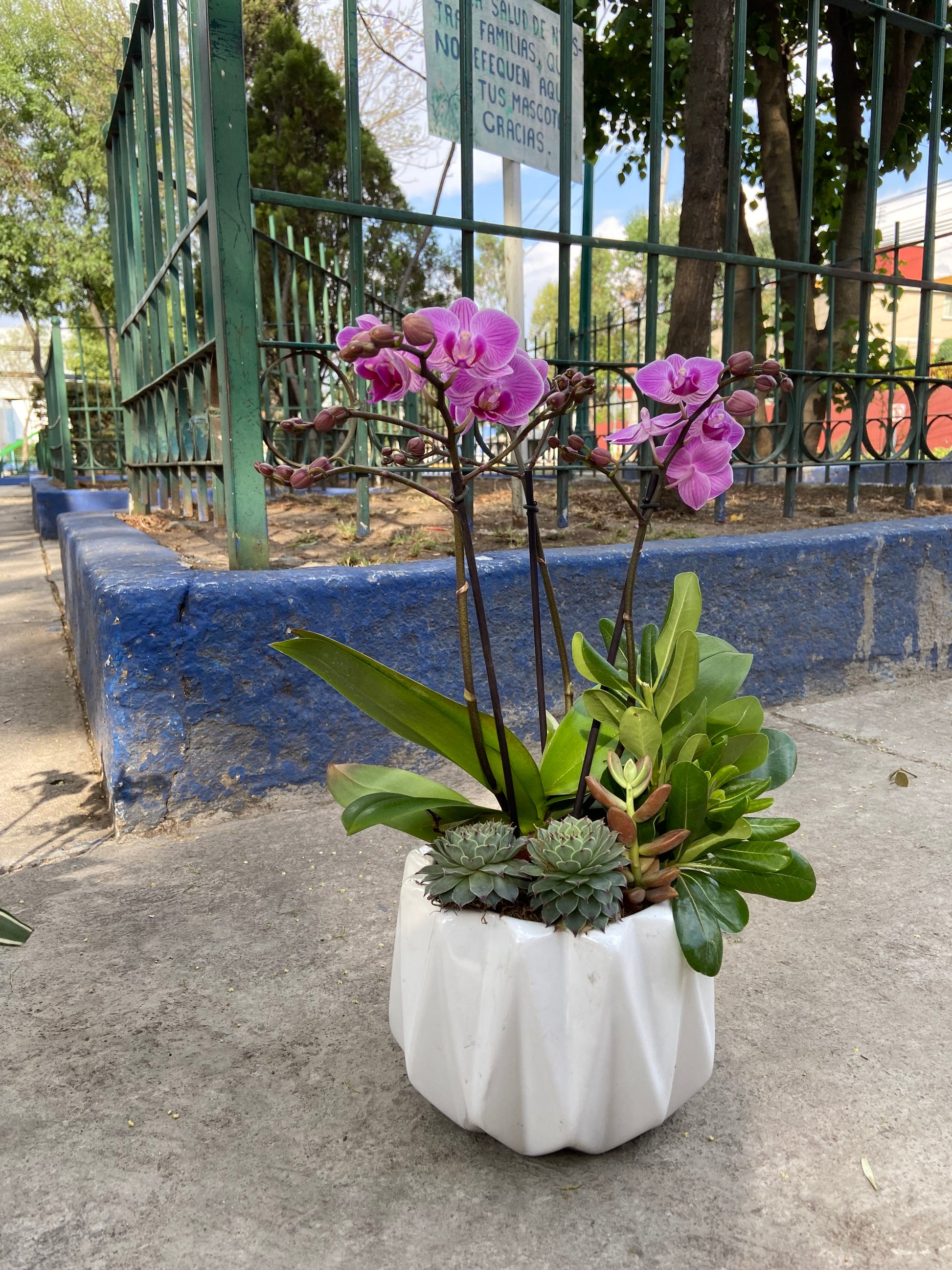 Es una maceta de mini orquídeas junto a suculentas y follaje verde en una maceta de cerámica