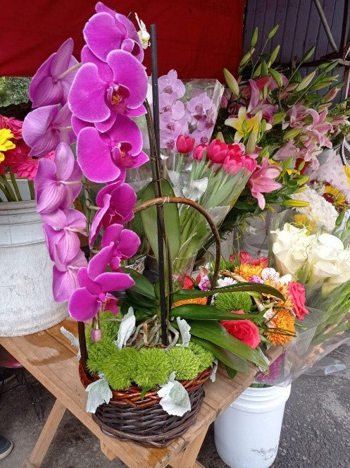 El arreglo esta compuesto por una orquidea cascada y follajes verdes adorandos en una canasta.