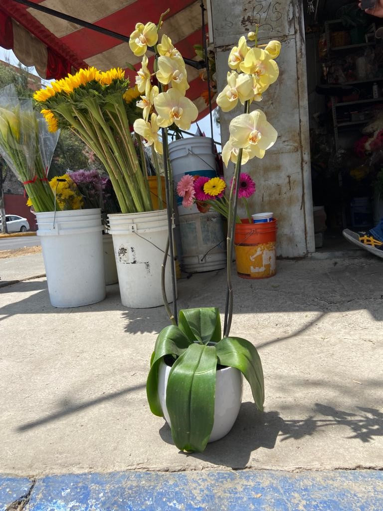 El arreglo esta compuesto por una orquidea de 2 tallos plantados en una maceta de ceramica.