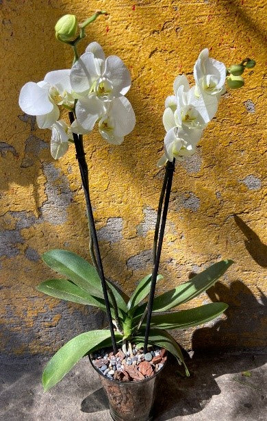 El arreglo esta compuesto por una orquidea de 2 tallos plantados en una maceta de cristal.