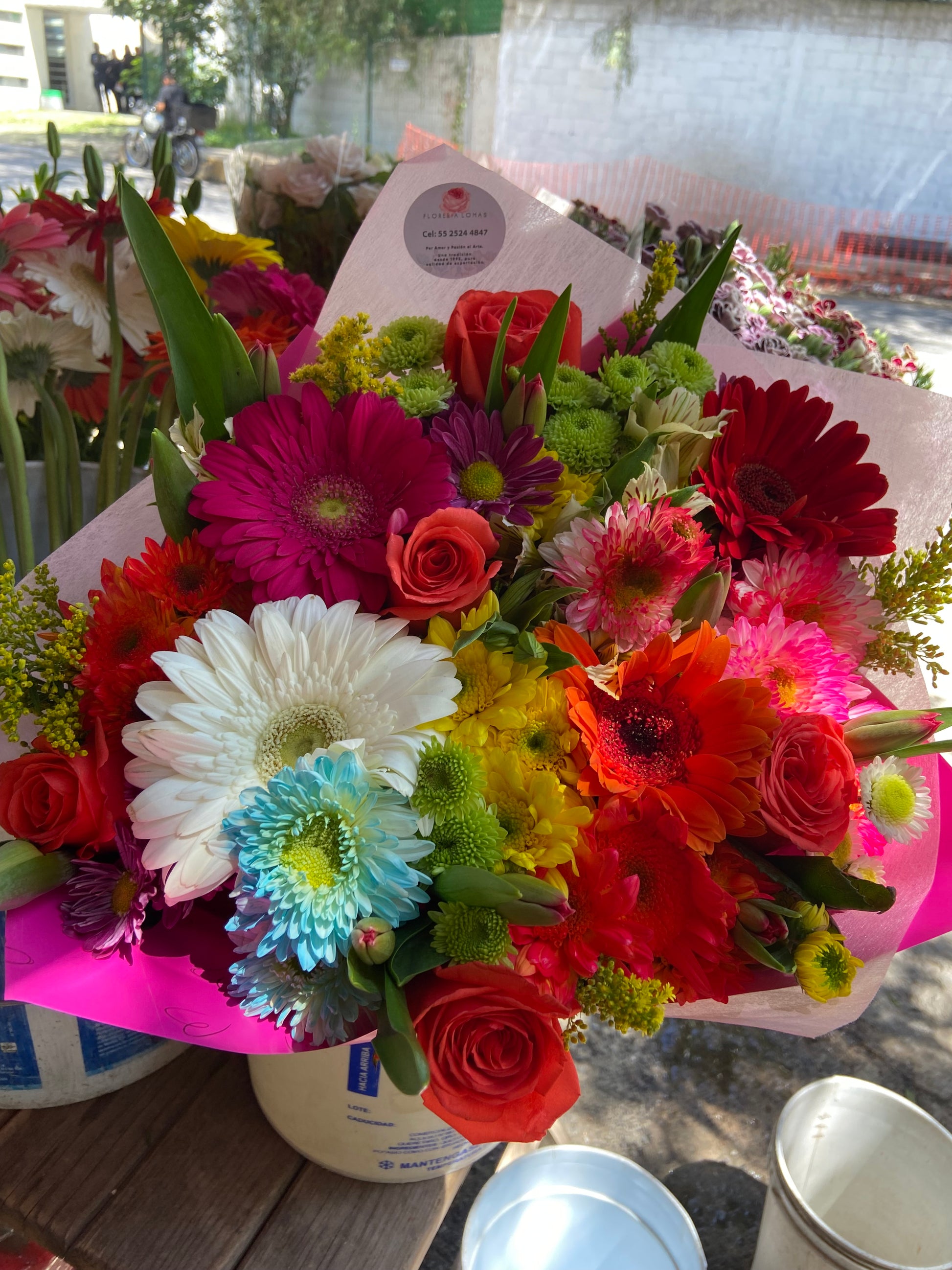 El ramo está compuesto por rosas, gerberas, tulipanes, flores de diferentes color así como follajes varios y papel de color.