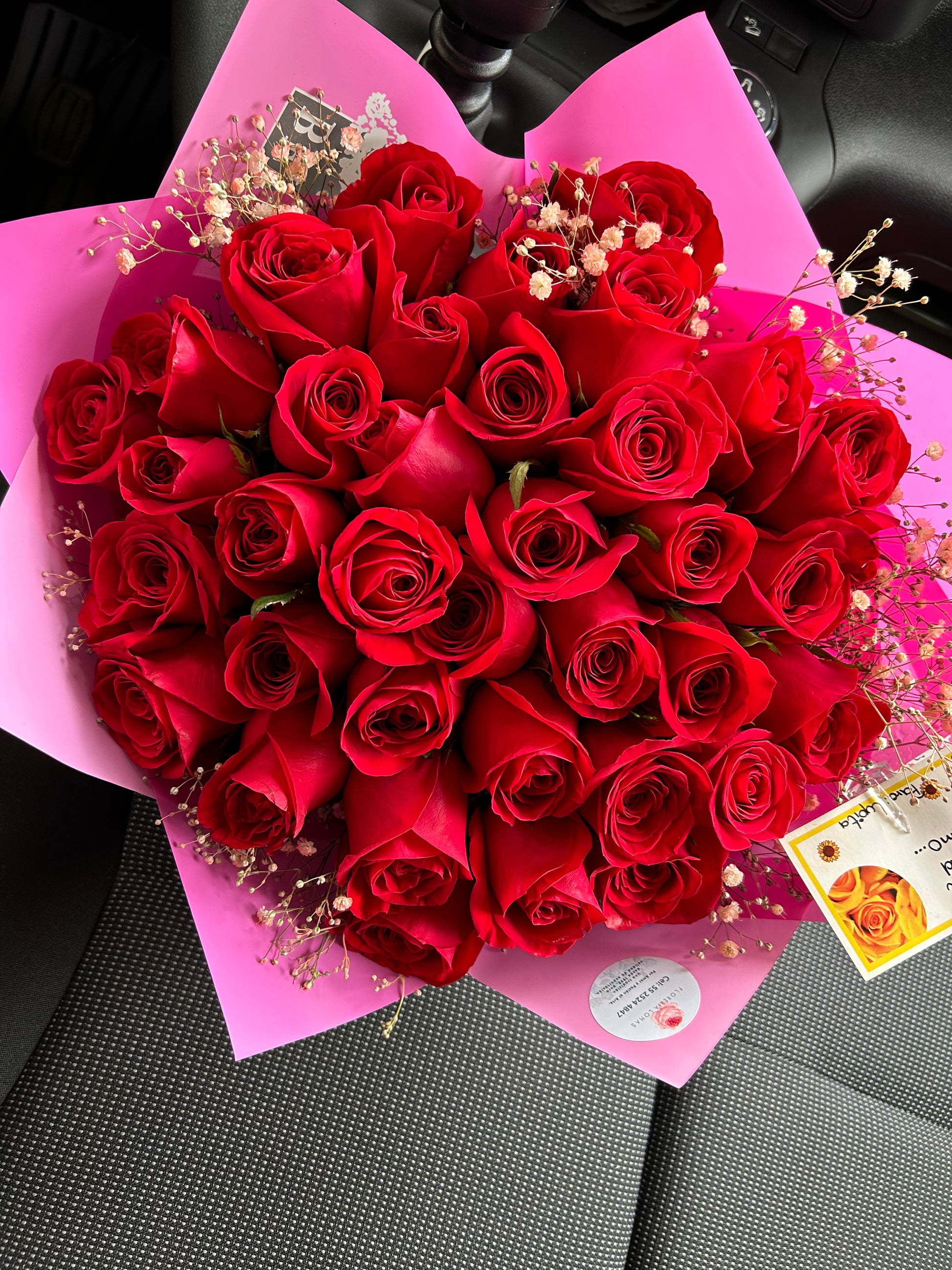 El ramo consta de 36 Rosas Rojas, Gypsophila color coral y papeles de color.