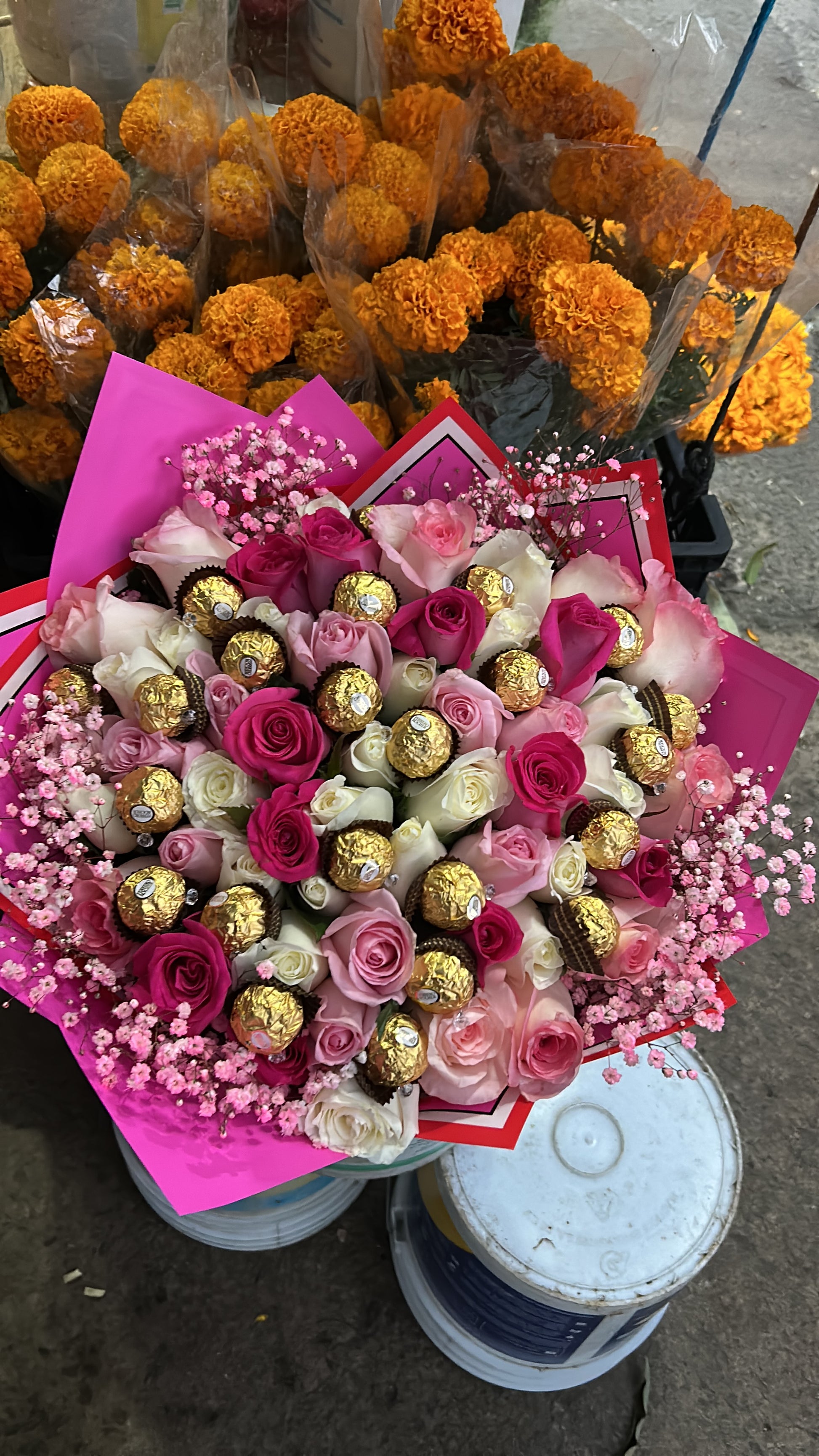 El ramo está compuesto por 70 Rosas de diferentes tonos de rosa y 24 chocolates ferrero rocher esparcidos en el ramo y decorado con papeles de color.
