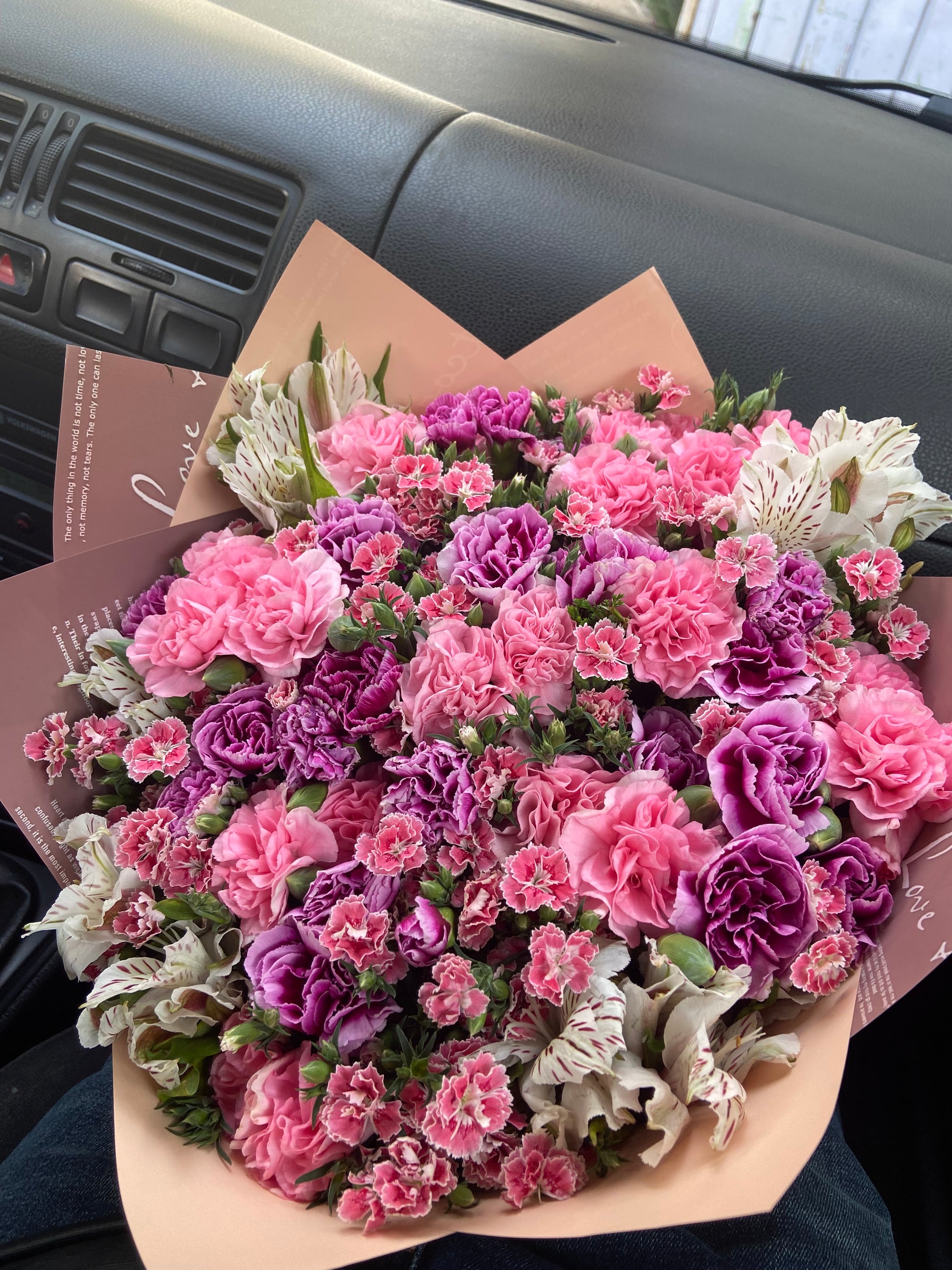 El ramo está compuesto por clavelinas de tonos rosas y morados, raffine tono rosa, astrolilis, follajes varios así como papel de color.