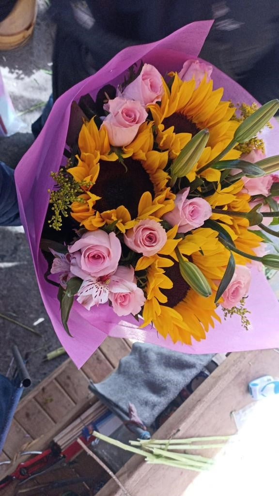 El ramo esta compuesto por lilis blancas, girasoles, rosas rosas, follajes varios y envueltos con papel de color.
