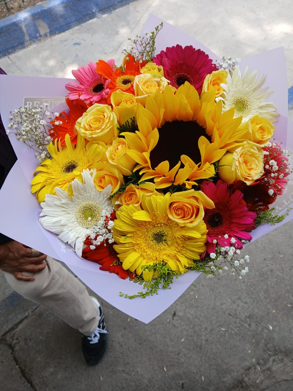 El ramo está compuesto por rosas amarillas, girasol, gerberas de color, follajes varios y papel de color.