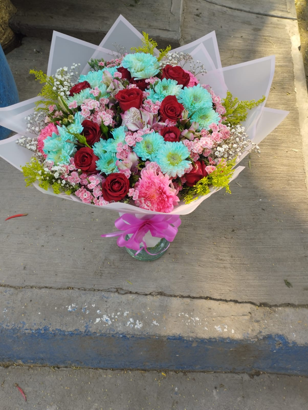 El ramo está compuesto por rosas rojas, flores azules, astrolilis, raffine, follajes varios y papel de color.
